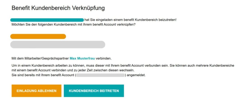 Sie können Ihren Account auch mit mehreren Kundenbereichen verknüpfen. Lassen Sie sich dabei einfach mit Ihrer benefit Account-Mailadresse in die unterschiedlichen benefit Kundenbereiche einladen. Dort können Sie anschließend eine individuelle E-Mailadresse als Gesprächspartner*in hinterlegen.