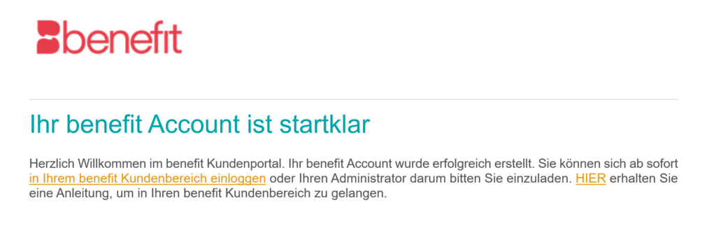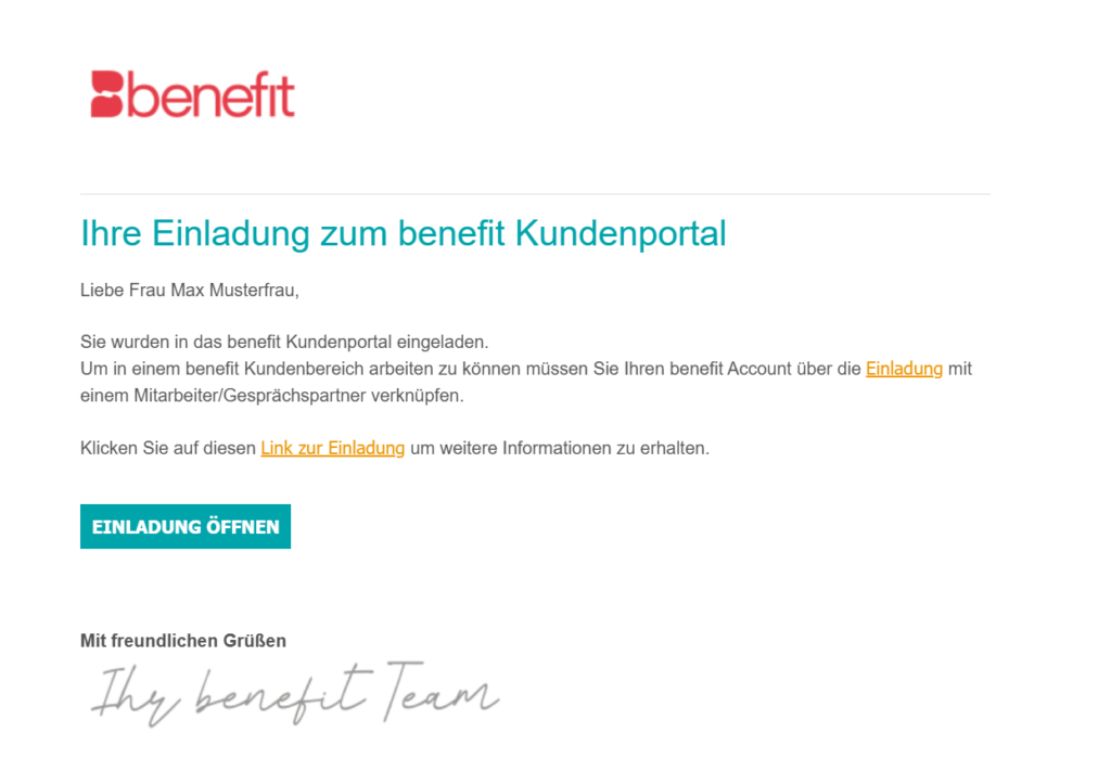 Sie haben nun eine Einladungsmail zu Ihrem benefit Kundenbereich erhalten. Folgen Sie bitte den nachfolgenden Schritten:
