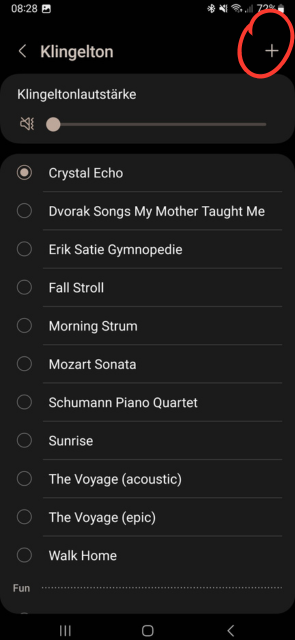 6. Nun können Sie zwischen den vorinstallierten Klingeltönen wählen. Wenn Sie eine persönliche Musikdatei aus Ihren Dateien wählen wollen, dann klicken Sie auf das „+“ in der rechten, oberen Ecke.