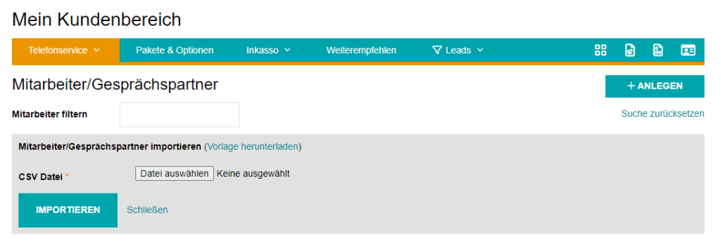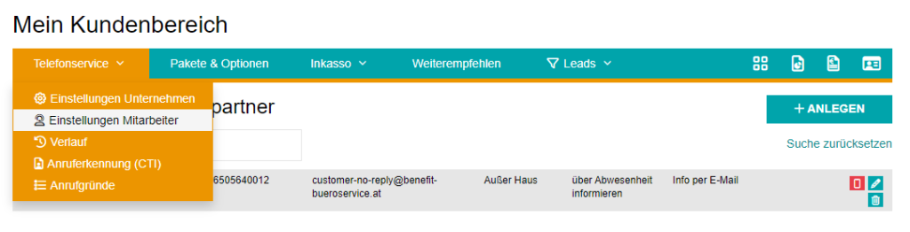 Öffnen Sie zunächst Ihren benefit Kundenbereich. Im Reiter “Telefonservice” können Sie die “Einstellungen Mitarbeiter” öffnen. Danach klicken Sie im rechten oberen Bereich den Button “+ Anlegen”.