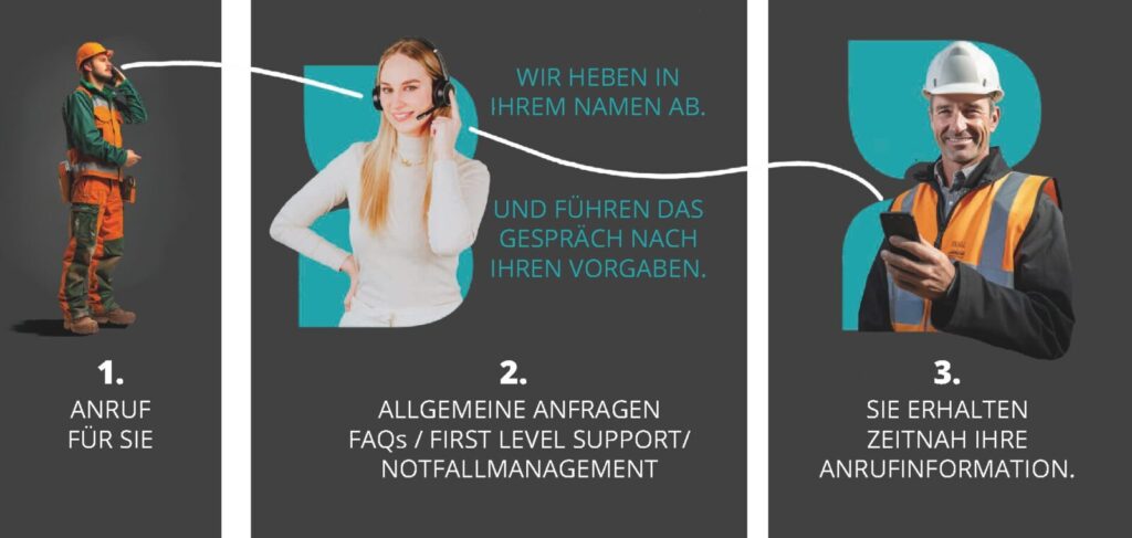 Das Gespräch wird anschließend nach Ihren Vorgaben geführt, ganz so, als würden die Mitarbeiter*innen bei Ihnen im Büro sitzen. - Sie erhalten eine Anrufinformation – Abschließend erhalten Sie und die zuständigen Mitarbeiter*innen im Unternehmen eine Anrufinformation mit allen aufgenommenen Daten und Informationen per E-Mail zugesandt. (Optional können Sie diese auch per SMS anfordern)