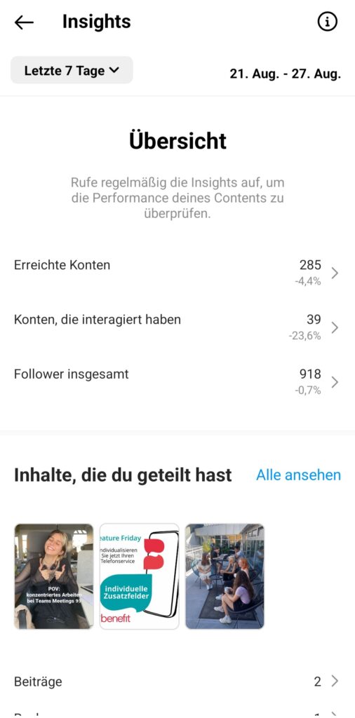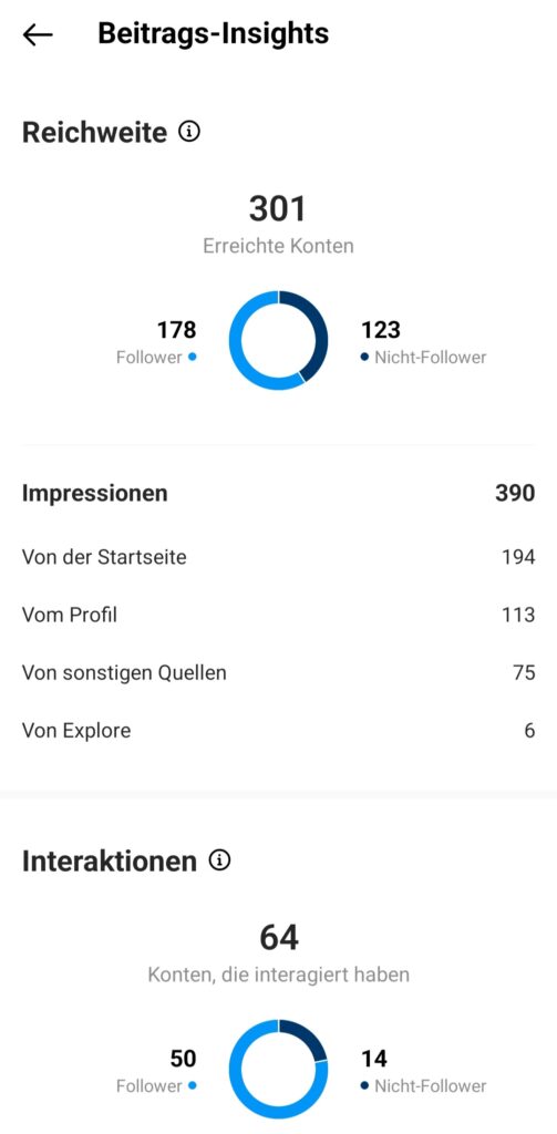 Somit können Sie Ihre Beiträge optimieren und Sie sehen welche Bilder oder Videos von der Follower*innenschaft besser angenommen werden. Story Statistiken: Auch zu den Instagram Storys gibt es Statistiken, diese zeigen Ihnen folgende Angaben: Reichweite, Impressionen, gesendete Antworten, Weiter gedrückt, Zurück gedrückt.